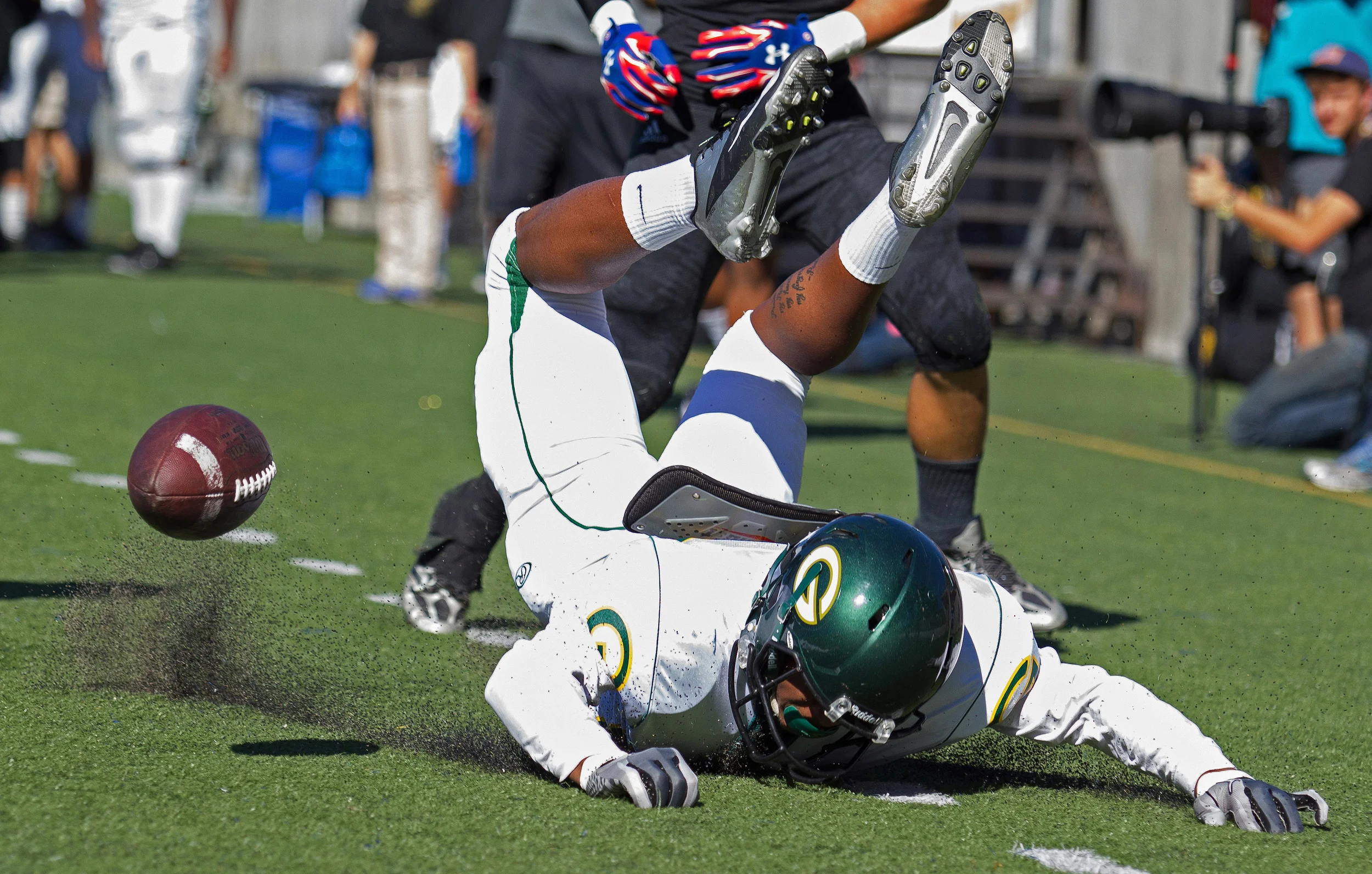 CHESTNUT HILL, MA - OCTOBER 07: Travon McMillian #34 of the Virginia Tech Hokies loses his helmet as he is tackled by the Boston College Eagles defense during the first half at Alumni Stadium on October 7, 2017 in Chestnut Hill, Massachusetts. (Photo by Tim Bradbury/Getty Images)